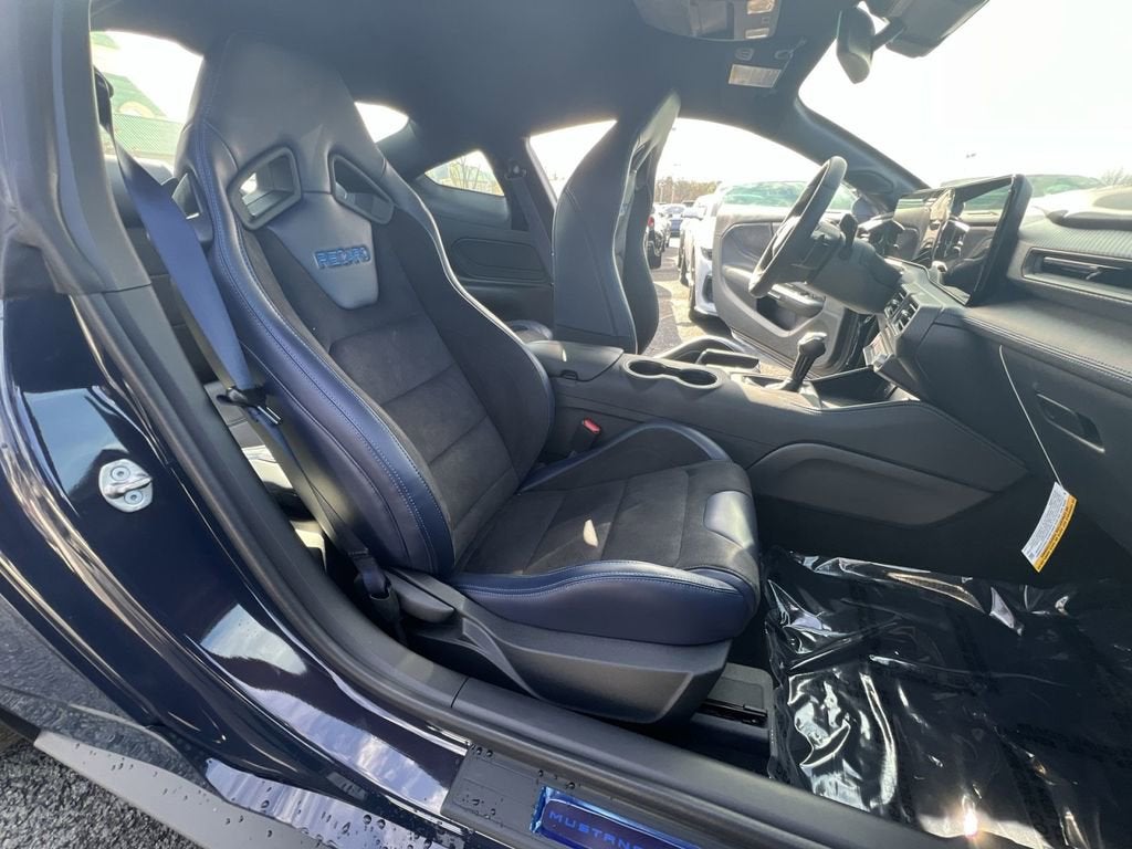 12 Speakers, 4-Wheel Disc Brakes, ABS brakes, Active Anti-Theft System, Adaptive suspension, Air Conditioning, Alloy wheels, Aluminum Foot Pedals, AM/FM radio: SiriusXM with 360L, AM/FM Stereo, Approach Detection, Auto High-beam Headlights, Auto-dimming Rear-View mirror, Automatic temperature control, B&O Sound System by Bang & Olufsen, Brake assist, Bumpers: body-color, Cloth/Vinyl Climate-Controlled Bucket Seats, Cloth/Vinyl Heated Bucket Seats, Compass, Dark Horse Appearance Package, Dark Horse Handling Package, Delay-off headlights, Driver door bin, Driver Seat & Mirrors Memory, Driver vanity mirror, Dual front impact airbags, Dual front side impact airbags, Electronic Stability Control, Emergency communication system: 911 Assist, Equipment Group 700A Deluxe Package, Exterior Parking Camera Rear, Four wheel independent suspension, Front anti-roll bar, Front Bucket Seats, Front Center Armrest, Front dual zone A/C, Front reading lights, Front Towing Hooks, Fully automatic headlights, HD Radio, Heated front seats, Heated steering wheel, Illuminated entry, Internet access capable: FordPass Connect, Knee airbag, Locking Center Console, Low tire pressure warning, Magnetic Damping System, Navigation system: Connected Navigation, Notorious Blue Painted Brake Calipers, Occupant sensing airbag, Outside temperature display, Overhead airbag, Overhead console, Painted Black Roof, Panic alarm, Passenger door bin, Passenger vanity mirror, Performance Front Aero Splitter, Performance Rear Spoiler w/Gurney Flap, Power door mirrors, Power driver seat, Power passenger seat, Power steering, Power windows, Radio data system, Rain sensing wipers, Rear anti-roll bar, Rear Parking Sensors, Rear window defroster, RECARO Micro-Suede/Vinyl Bucket Seats, RECARO Sport Seats, Remote keyless entry, Security Package, SiriusXM w/360L, Speed control, Speed-sensing steering, Speed-Sensitive Wipers, Split folding rear seat, Spoiler, Sport steering wheel, Steering wheel mounted audio controls, SYNC 4, Tachometer, Telescoping steering wheel, Tilt steering wheel, Traction control, Trip computer, Unique Hood Graphic, Universal Garage Door Opener (UGDO), Variably intermittent wipers, Voltmeter, Wheel Locking Kit, Wheels: 19 x 10.5 Fr/19 x 11 Rr Tarnished Alum, Wheels: 19 x 9.5 Fr & 19 x 10 Rr Aluminum.