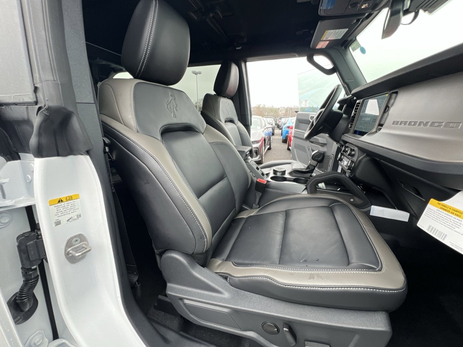 18 Bright Machined Aluminum Wheels, 360-Degree Camera, 4-Wheel Disc Brakes, 7 Speakers, ABS brakes, Adaptive Cruise Control, Air Conditioning, Alloy wheels, AM/FM radio: SiriusXM with 360L, AM/FM Stereo, Auto High-beam Headlights, Auto-dimming Rear-View mirror, Automatic temperature control, Brake assist, Carbonized Gray Molded-in-Color Hard Top, Compass, Connected Navigation, Delay-off headlights, Driver door bin, Driver vanity mirror, Dual front impact airbags, Dual front side impact airbags, Electronic Stability Control, Emergency communication system: 911 Assist, Equipment Group 314A Lux Package, Evasive Steering Assist, Exterior Parking Camera Rear, Ford Connectivity Package (1-Year Included), Front anti-roll bar, Front Bucket Seats, Front Center Armrest, Front dual zone A/C, Front fog lights, Front License Plate Bracket, Front Parking Sensors, Front reading lights, Front wheel independent suspension, Fully automatic headlights, Hard Top Sound Deadening Headliner, Heated door mirrors, Heated front seats, Heated Leather-Trimmed/Vinyl Bucket Seats, Heated steering wheel, High Clearance Fender Flares, High Clearance Suspension, Illuminated entry, Information on Demand Panel, Integrated roll-over protection, Leather Shift Knob, Low tire pressure warning, Navigation system: Connected Navigation, Occupant sensing airbag, Outside temperature display, Overhead airbag, Overhead console, Panic alarm, Passenger door bin, Passenger vanity mirror, Position-Sensitive Bilstein Shock Absorbers, Power door mirrors, Power driver seat, Power passenger seat, Power steering, Power windows, Radio data system, Rear seat center armrest, Rear-Window Defroster and Washer, Remote keyless entry, Sasquatch Package, Security system, Sideview Mirrors, SiriusXM with 360L, Speed control, Split folding rear seat, Steering wheel mounted audio controls, SYNC 4, Tachometer, Telescoping steering wheel, Tilt steering wheel, Traction control, Trip computer, Variably intermittent wipers, Voltmeter, Wheels: 17 Matte Black Alloy.